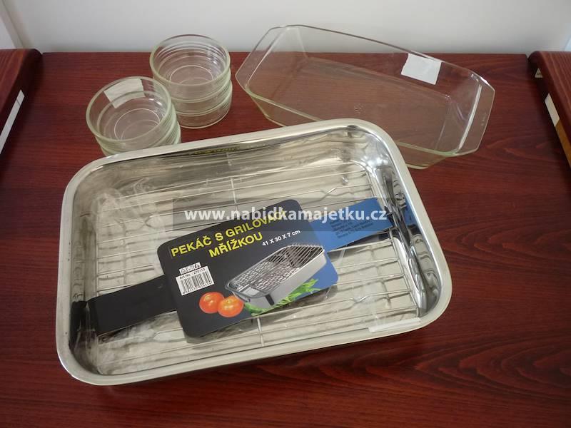 Jedná se o nepoužitou skleněnou zapékací mísu, 6 ks skleněných misek na kompot a nepoužitý pekáč s grilovací mřížkou, rozměr 41x30x7 cm.