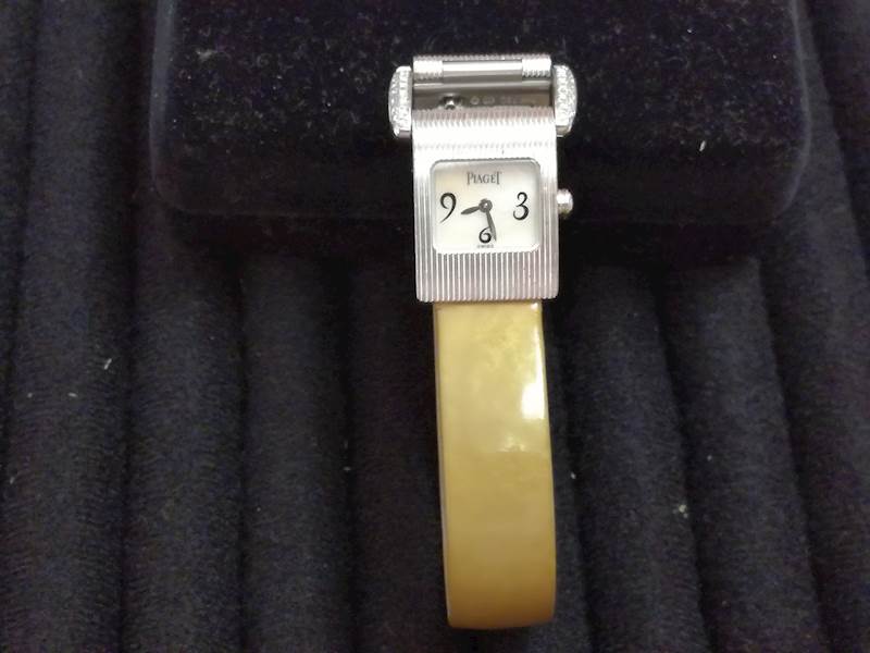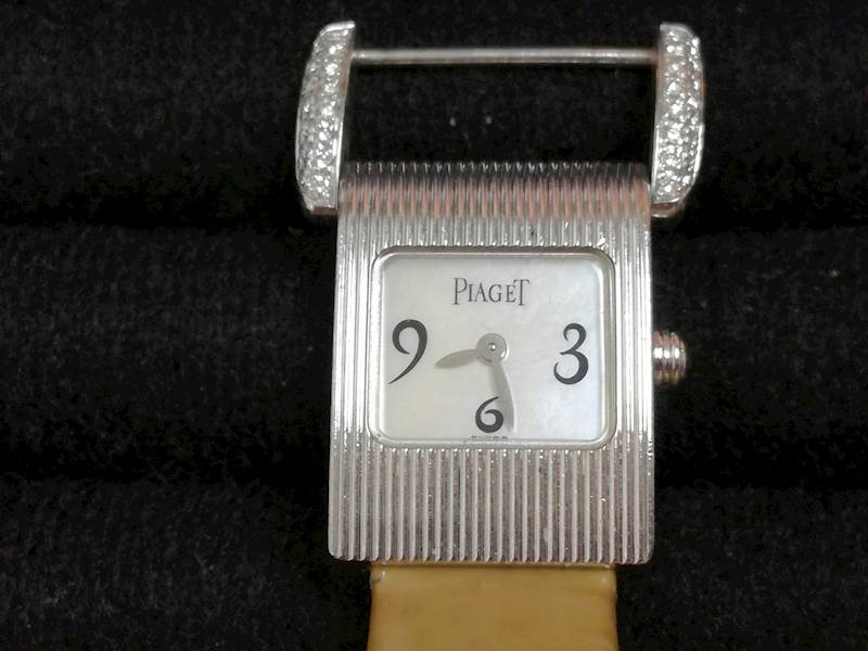 Použité dámské náramkové hodinky švýcarské značky Piaget, 522 669974, opatřené quartzovým strojkem, mají obdélníkové pouzdro. Pouzdro a spona, která netradičně navazuje na pouzdro, jsou vyrobeny z bílozlaté slitiny ryzosti 750/1000, náramek je kožený. Celková hmotnost činí 36,15 g, z toho hmotnost zlata činí 8,20 g a hmotnost obecného kovu 2,00 g. Pouzdro je zdobeno zafasovanými diamanty výbrusu Round Diam. Cut (30 ks á 0,015 ct G-H/VS). Hodinky mají mírné známky opotřebení běžným nošením.