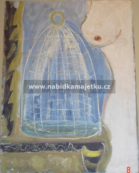 1. obraz Ptačí klec, technika: olej, podklad: sololit, rozměr: 65 x 85 cm,
