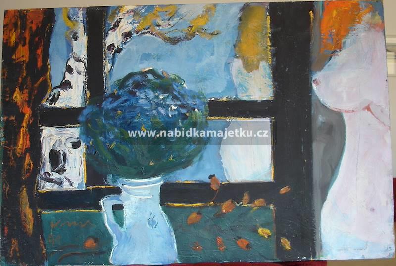 6. obraz Kytice na okně, technika: olej, podklad: sololit, rozměr: 86 x 57 cm,