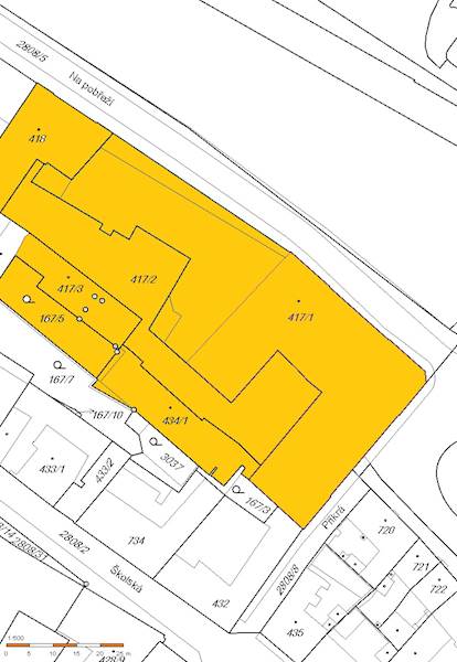 Celý areál je postaven na převážně rovinatém pozemku, na jeho západním okraji je pro vyrovnání terénu postavena opěrná zeď. Areál je přístupný pouze prostorově omezeným průjezdem budovou postavenou na parcele: st. č. 417/1 (jižní hranice areálu). Budovy jsou většinou propojeny a jsou postaveny na obvodu areálu tak, že uvnitř tvoří dvůr nepravidelného tvar se zpevněnou asfaltovou plochou (pozemek p.p.č. 417/2).