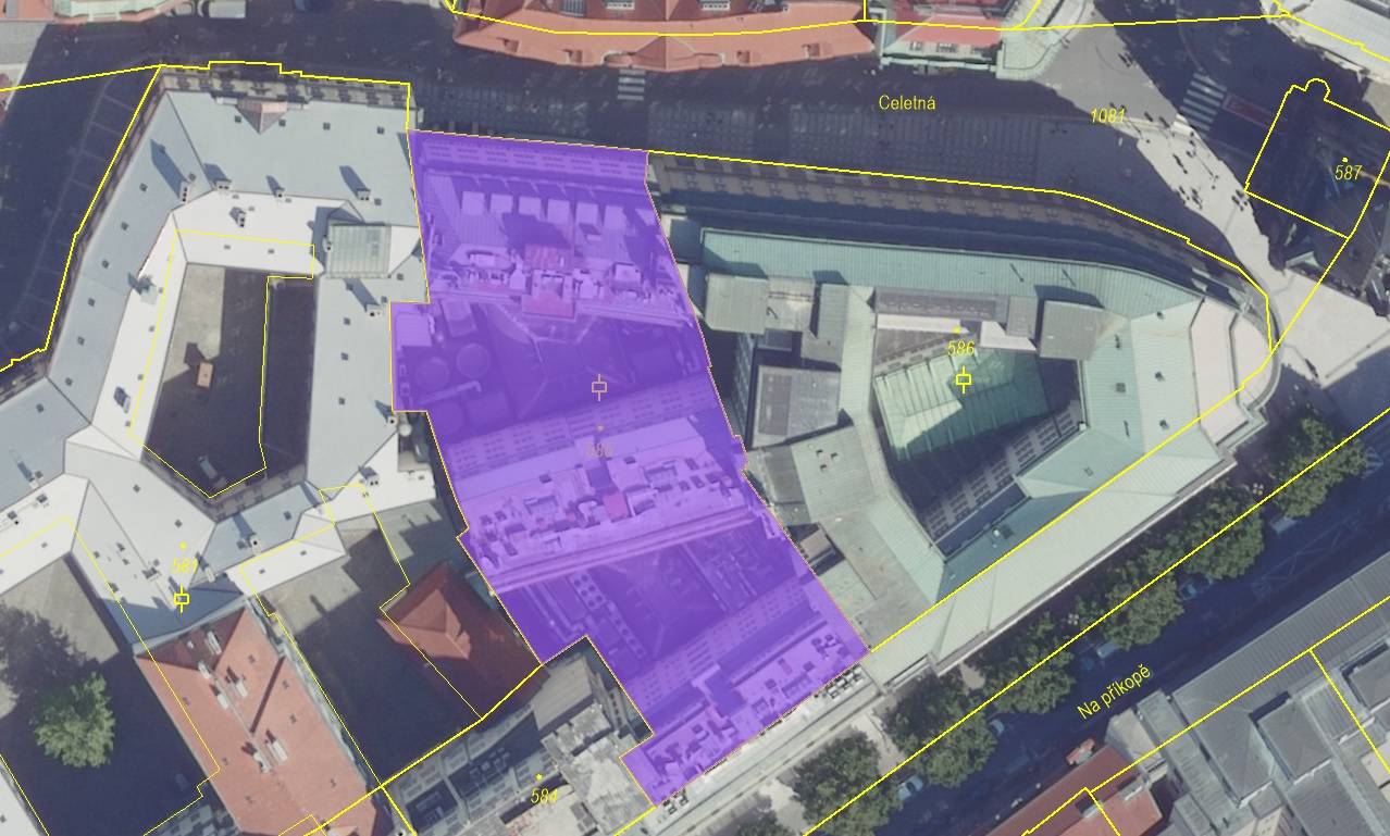 Zadavatel aukce upozorňuje, že v prostorách bistra Zebra na levé straně pasáže při vstupu z Celetné ulice je využíván prostor zázemí bistra přesahující celkovou výměrou cca 2 m2 do prostor sousedního objektu č.p. 969.