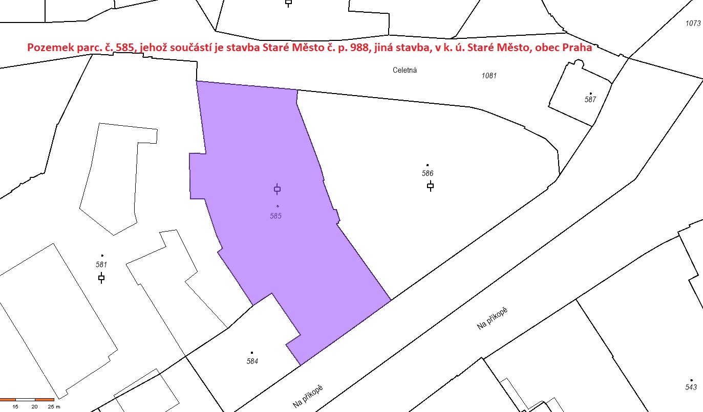 Pozemek parc. číslo: 585 o výměře 2254 m2, druh pozemku: zastavěná plocha/nádvoří, způsob ochrany: nemovitá kulturní památka, pam. rezervace - budova, pozemek v památkové rezervaci, součástí pozemku je stavba č.p. 988 (jiná stavba), vše zapsáno na LV 60000 pro katastrální území Staré Město, obec Praha, v katastru nemovitostí vedeném Katastrálním úřadem pro hlavní město Prahu, Katastrálním pracovištěm Praha.