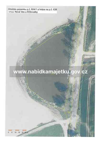 Jedná se o pozemek p.č. 604/1 (výměra 5484), včetně rybníka a hráze na pozemku p.č. 638 (bez tohoto pozemku), k.ú. Nová Ves u Křižovatky, obec Křižovatka, okres Cheb.