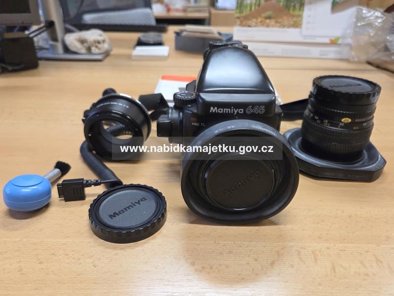 Fotoaparát MAMIYA 645 Pro TL s příslušenstvím, rok pořízení 1999, pořizovací cena 94 174,24 Kč. Jedná se o středoformátový fotoaparát na svitkové filmy, funkční,