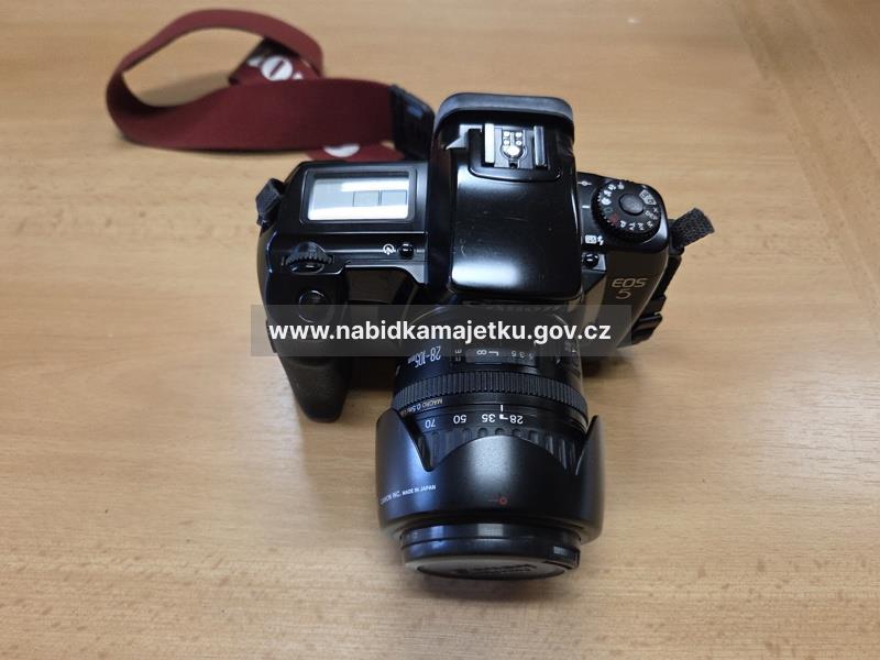 Fotoaparát CANON EOS 5/EF 28-1058 USM, rok pořízení 1999, výrobní číslo 3200838, pořizovací cena 45 500 Kč. Fotoaparát je zastaralý, funkční.