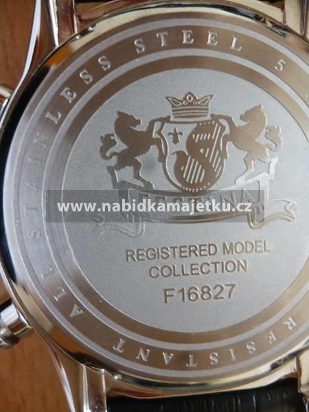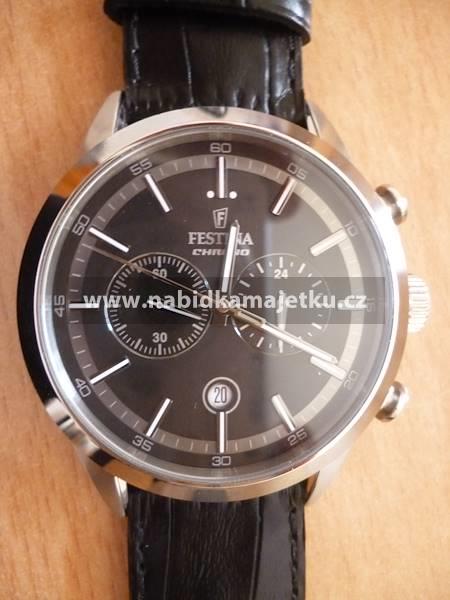 Jedná se o téměř nové pánské hodinky stříbrné barvy zn. FESTINA CHROMO s černým koženým páskem. Dle textu na zadní straně pláště hodinek, pochází hodinky z kolekce registrovaného modelu. Nabízenou movitou věc nelze reklamovat. Z tohoto důvodu se zájemcům doporučuje zúčastnit se prohlídky předmětu aukce.