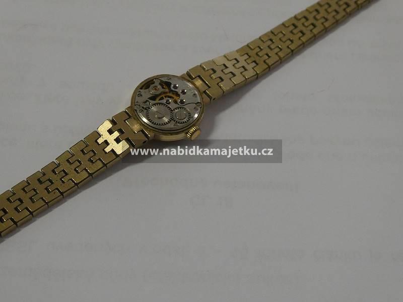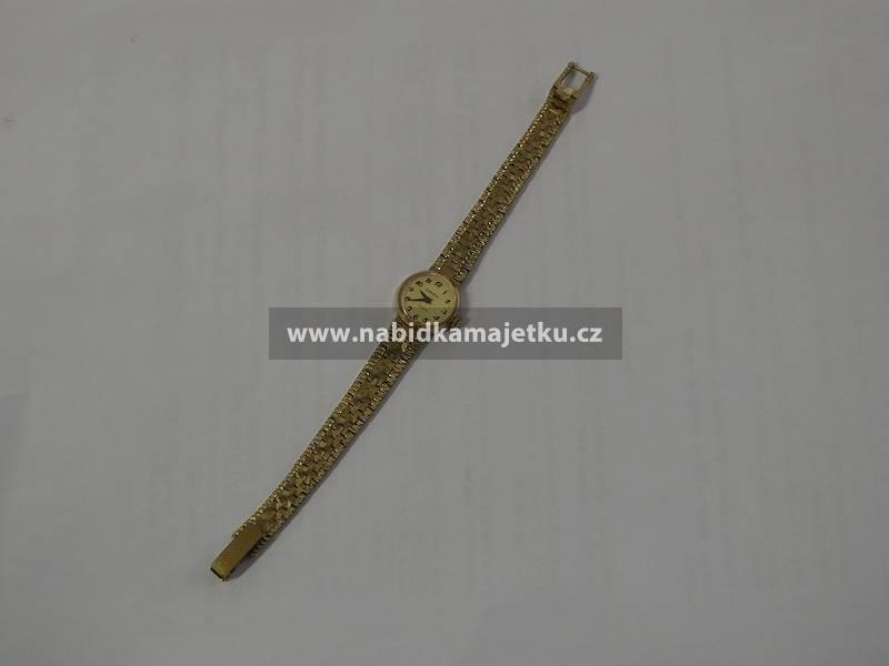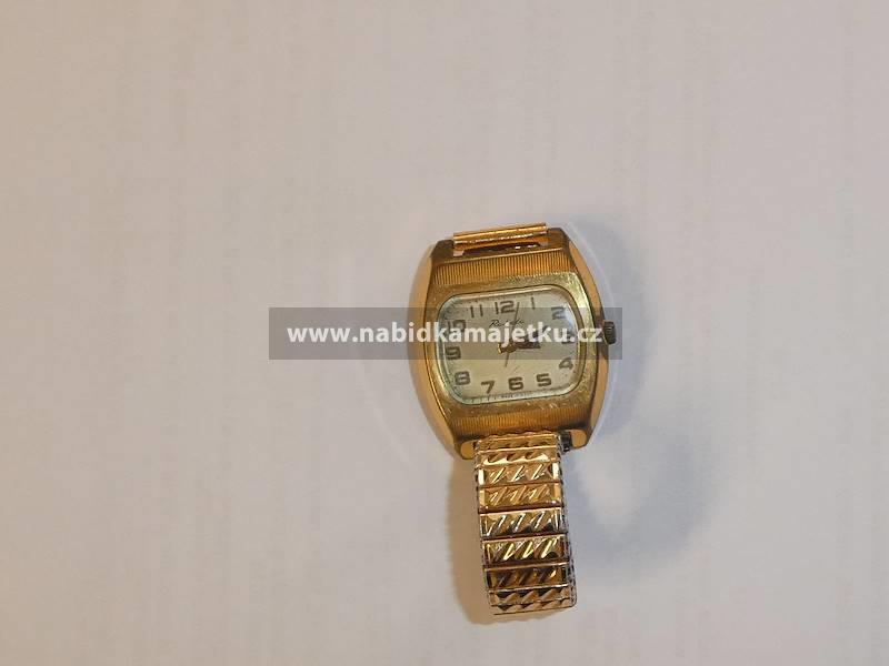 • Hodinky Chaika: starší použité dámské hodinky ze žlutého kovu, postrádající zadní kryt, na kovovém náramku.