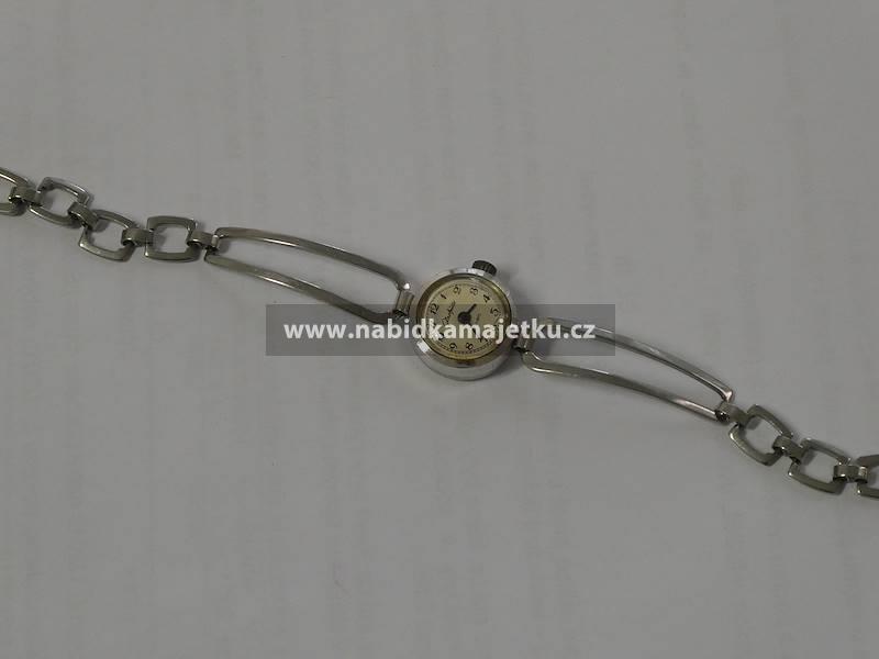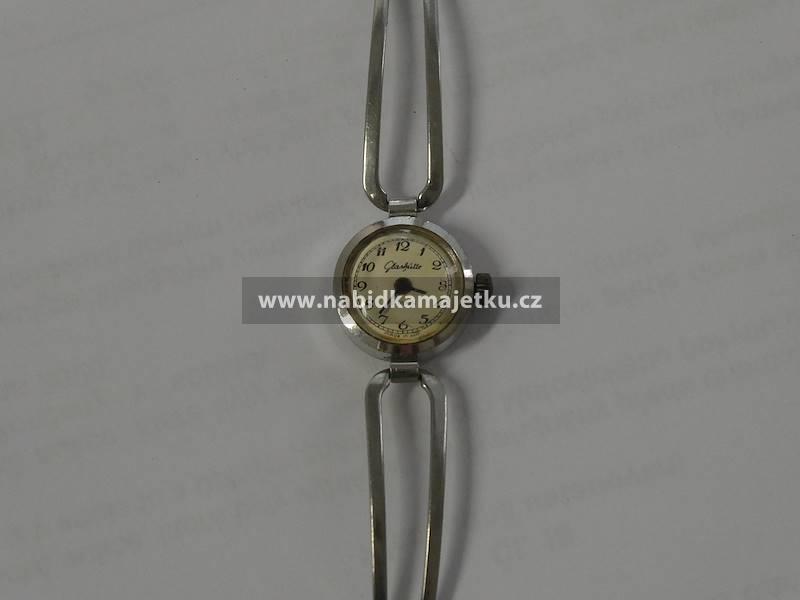 • Hodinky Glashütte: starší použité dámské hodinky z bílého kovu, elegantního vzhledu, německé produkce, na kovovém náramku.