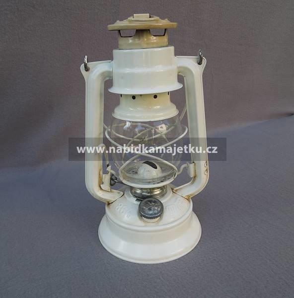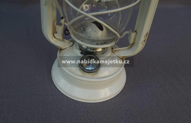 Jedná se o legendární petrolejovou lampu vyrobenou v bývalém Československu kolem roku 1964 společností MEVA pod označením MEVA 864. Lampa se skládá ze skleněné baňky a plechové kostry. Výška lampy je 24 cm. Kostra má elegantní bílé provedení, pouze horní klobouček je spíše béžový, neboť barva již zežloutla působením tepla z lampy. Má pohodlné držadlo na přenášení a očko k zavěšení. Tuto lampu je možno postavit na stůl nebo zavěsit na stěnu. Jako palivo se používá kvalitní petrolej pro svícení nebo přírodní lampový olej. Nádoba na petrolej má objem 0,3 litru. Na jednu náplň vydrží svítit až 20 hodin dle výšky vysunutí knotu. Knot je plochý, o šířce 12 mm. Jedná se o použitou věc, opotřebenou běžným užíváním. Zadavatel nezaručuje její funkčnost a movitou věc nelze reklamovat. Z tohoto důvodu se doporučuje zájemcům si předmět aukce prohlédnout.
