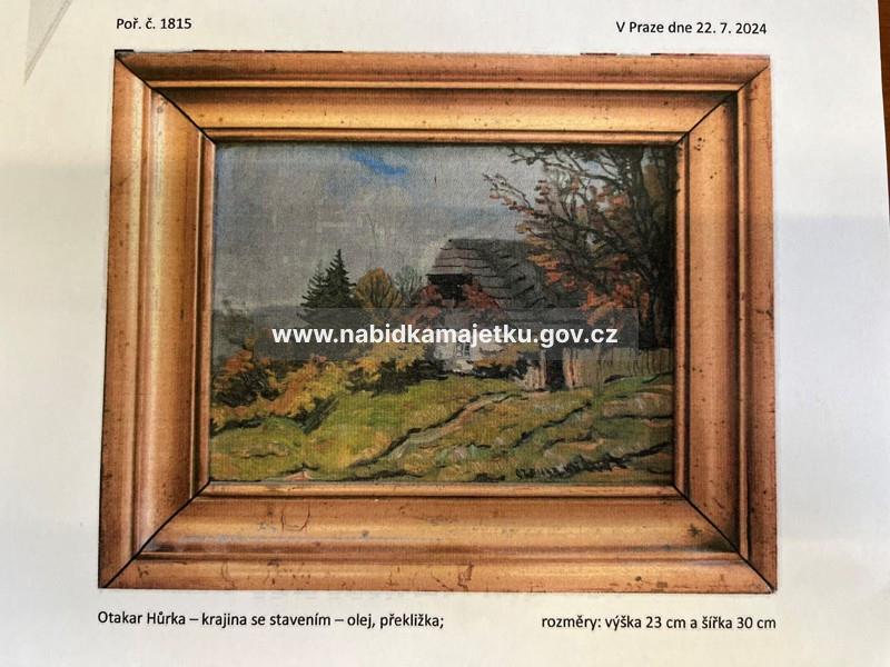 Jedná se závěsný obraz o rozměrech výška 23 cm, šířka 30 cm, technika olej na překližce, vpravo dole signovaný Otakar Hůrka, bez datace. Adjustace – dřevěný lištový rám, zlacený. Jedná se o starší použitou movitou věc. Zadavatel ani Provozovatel nezaručují funkčnost Předmětu aukce a tuto movitou věc nelze reklamovat. Z tohoto důvodu se doporučuje zájemcům se zúčastnit prohlídky Předmětu aukce.